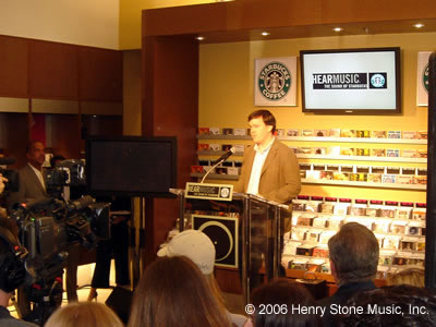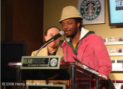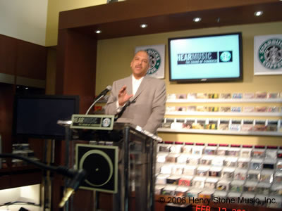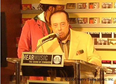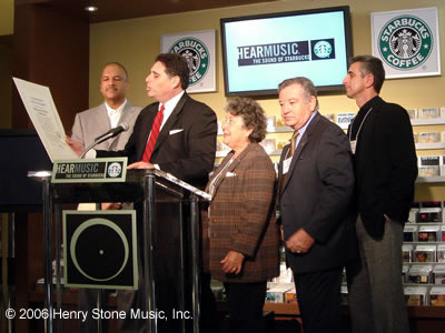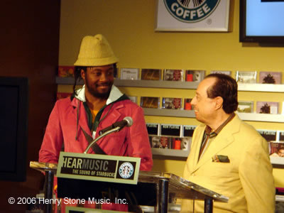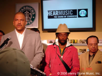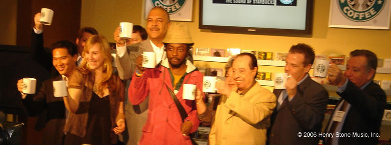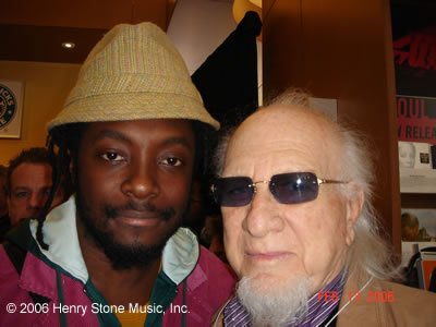 Henry Stone hangs out with the other celebrities, Will.I.Am. (Black Eyed Peas), Sergio Mendes, Sonya Kitchell Featured Artist, Ken Lombard – President of Starbucks Entertainment, Commissioner Matti Bower and Rudy Perez.